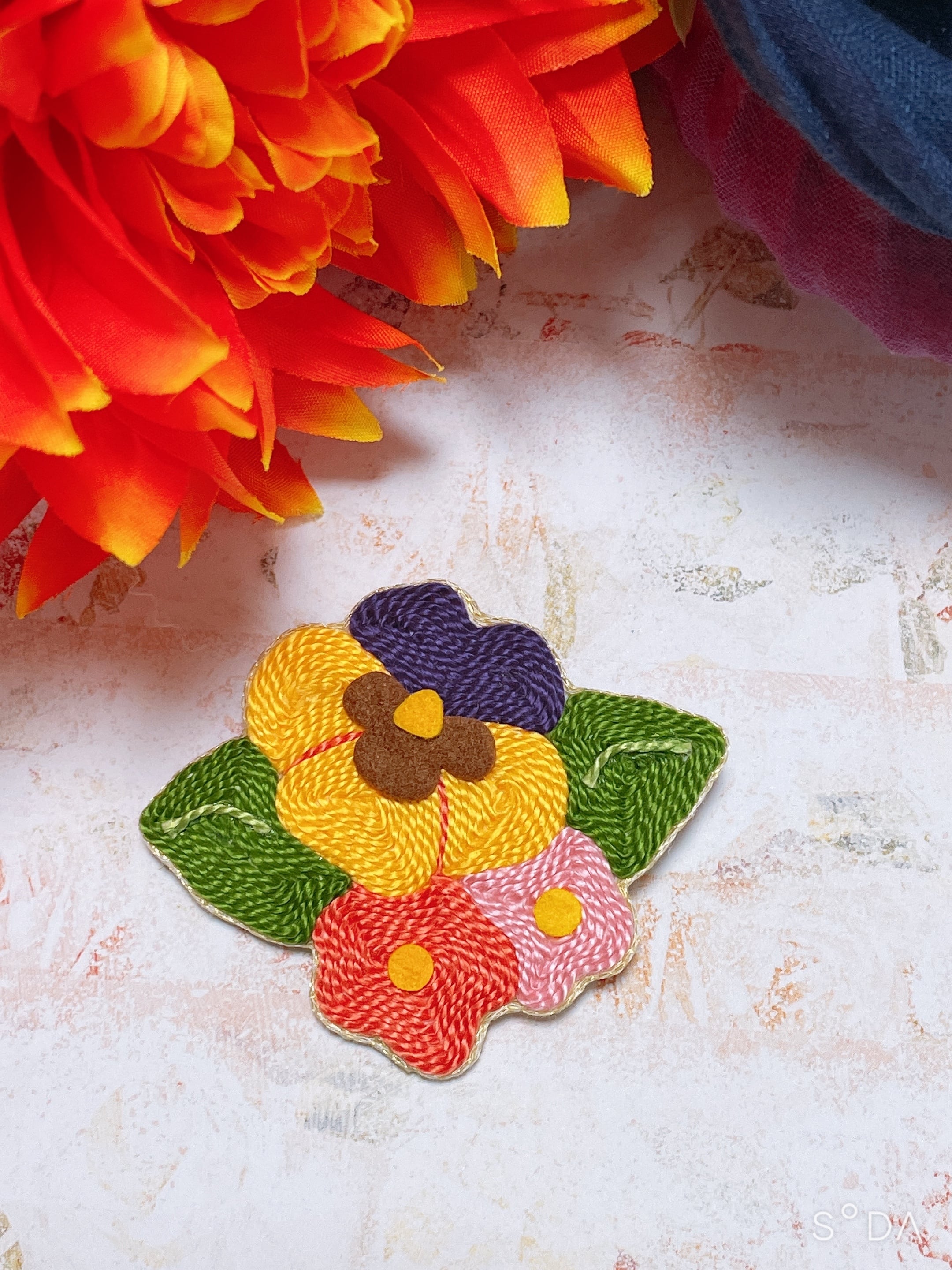 また、この刺繍糸は手作業で丁寧に隙間なく埋めておりますので、より生花に近いブローチになりました。